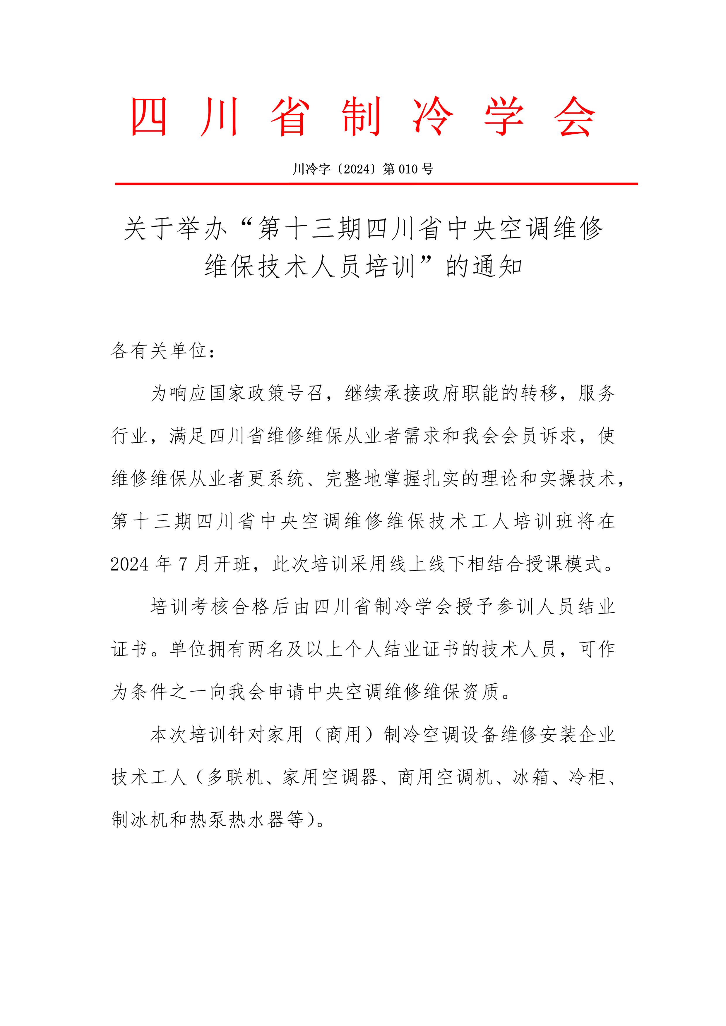 關(guān)于舉辦“第十三期四川省中央空調(diào)維修維保技術(shù)人員培訓(xùn)”的通知